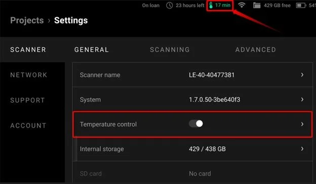 An effective way to ensure this temperature regime compliance is to use the “Temperature control” feature (available starting from Artec Leo 1.6 release).