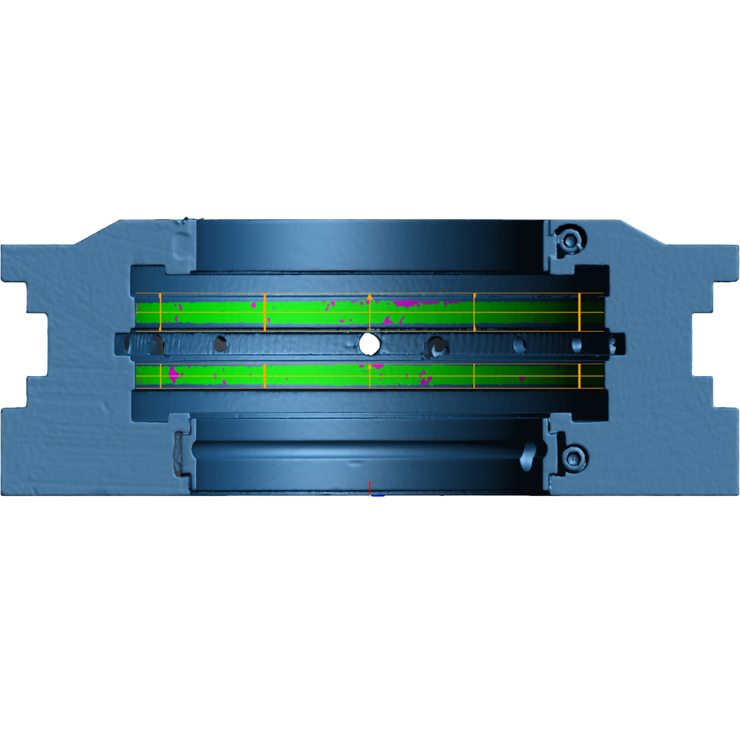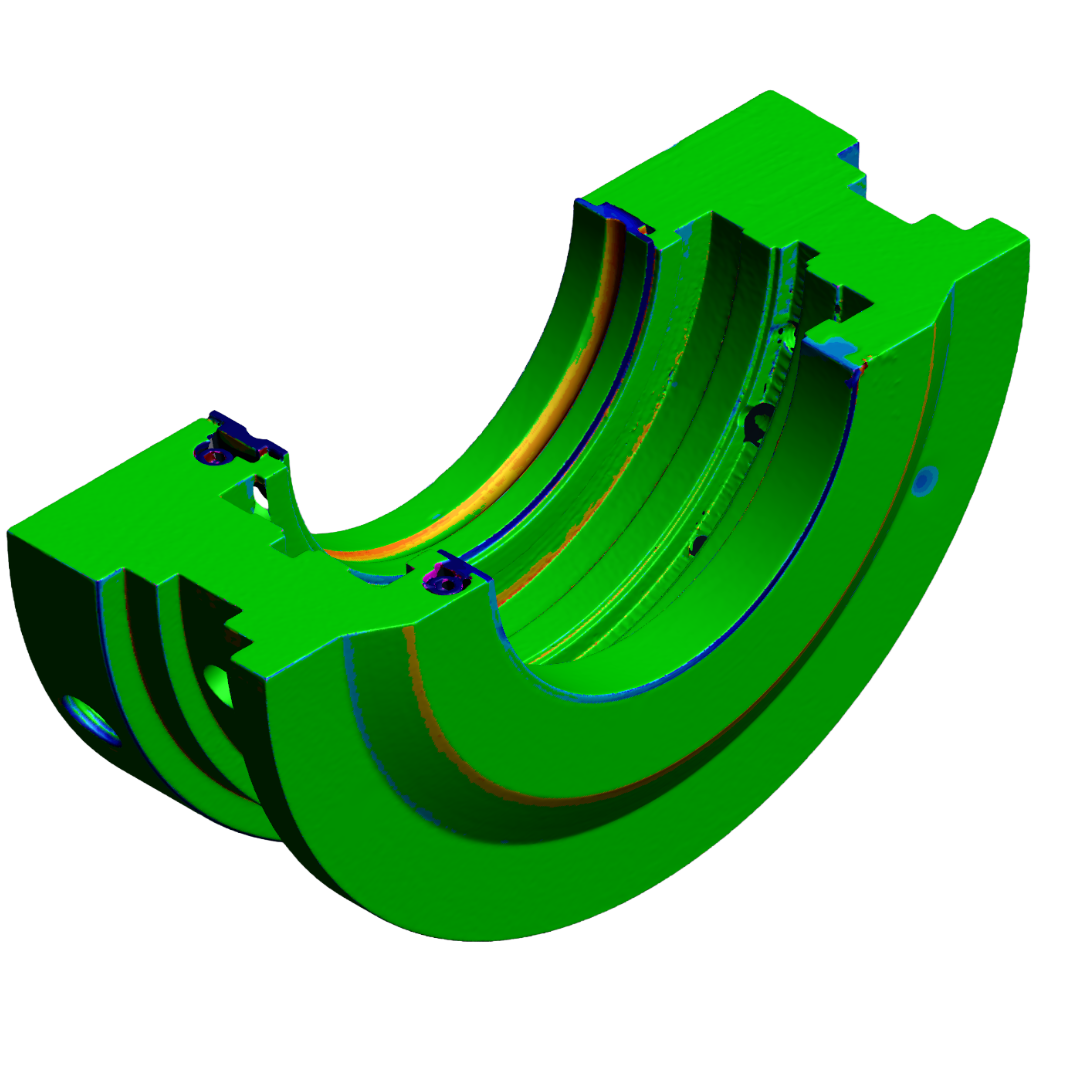 Once rebuilt or machined, the part is rescanned and verified to ensure all deviations are within tolerance limits — confirming fit before physical installation.